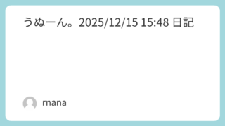 日記うぬーん。2025/12/15 15:48 日記 どうも。今日は割と元気です。このままいけたらいいな、なルナナです。今日あったこと。彼氏が妙なもの思い出したらしい。そいでメンタル面が良くないので朝から付き合っていた。作業(彼氏のメンタル保全)となってしまったのは不本意ではある……がまぁわり... 2025.12.15日記精神整理記録