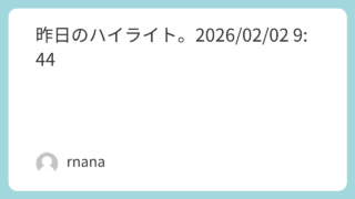 日記 昨日のハイライト。2026/02/02 9:44 えーっと、書かなかったっけ、昨日。まぁ、02/01のハイライトです。実家に泊まって買い物して帰ってきました。彼氏とは……だいぶ個人的には、安定してきたと思っています。デフォ10時までってのも決めましたし。まぁ私のなにがいいのかようわからんで... 2026.02.02 日記未分類記録